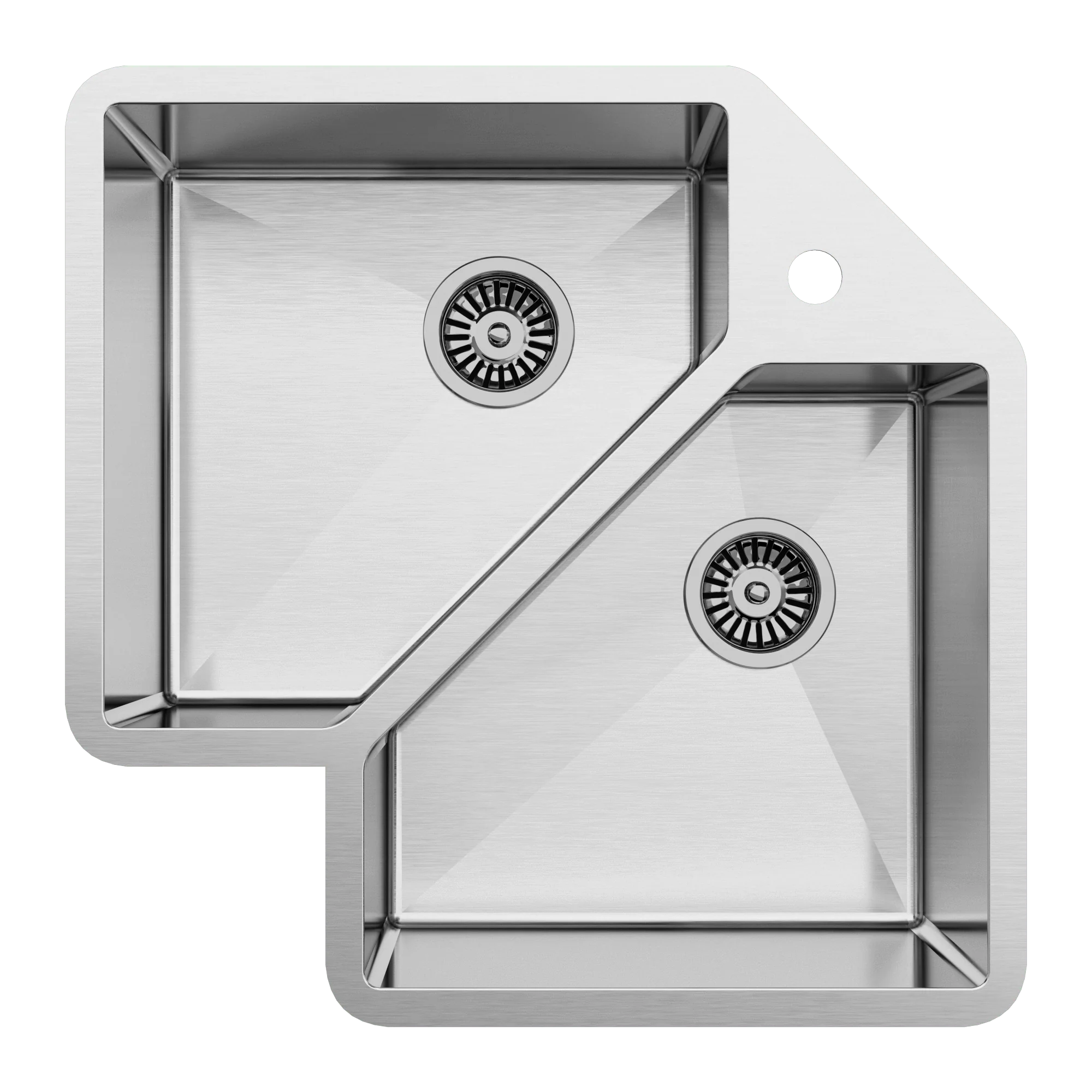 This is why we decided to design that was symmetrical so it was still appealing and had the functionality of a double bowl sink, and also adding a modern low profile lip so that it could be installed both as an undermount sink or topmount sink and still have high functionality and utilisation of the corner in the kitchen and utilising the awkward kitchen cabinet space.